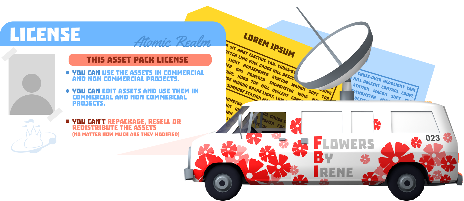 - Repackage, resell or redistribute the assets (no matter how much are they modified).